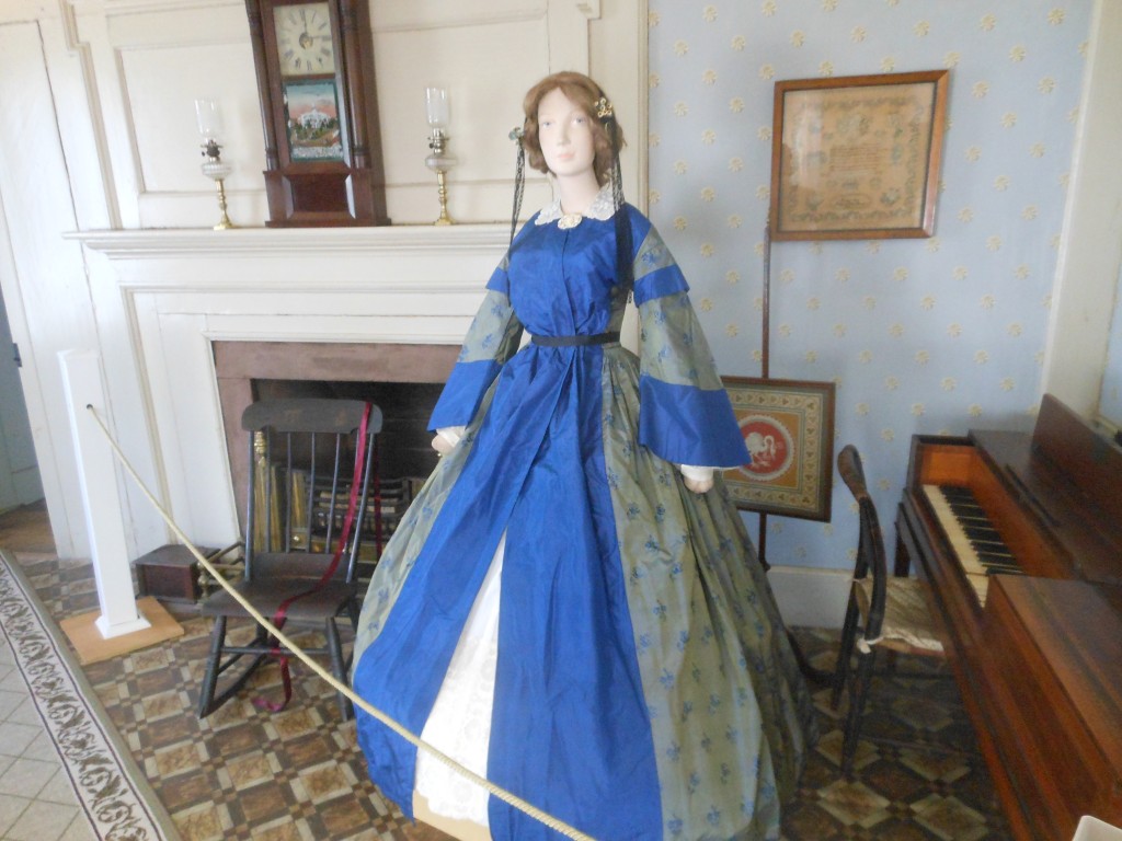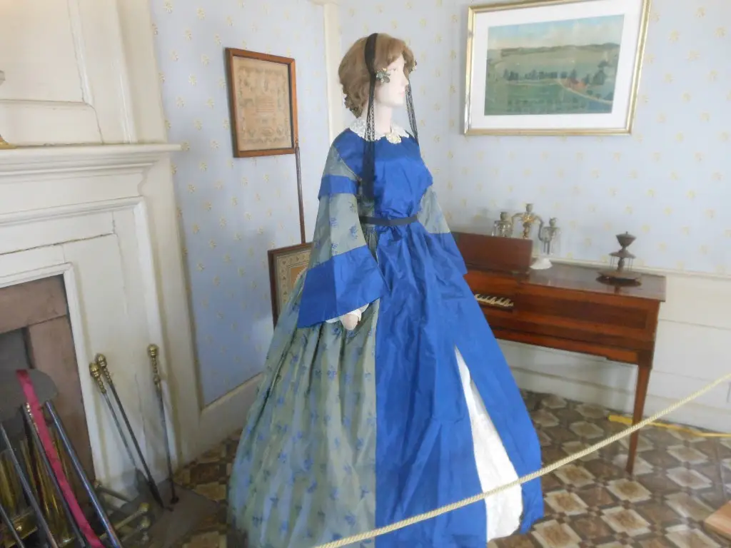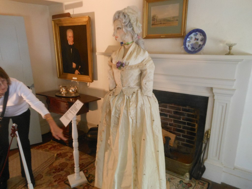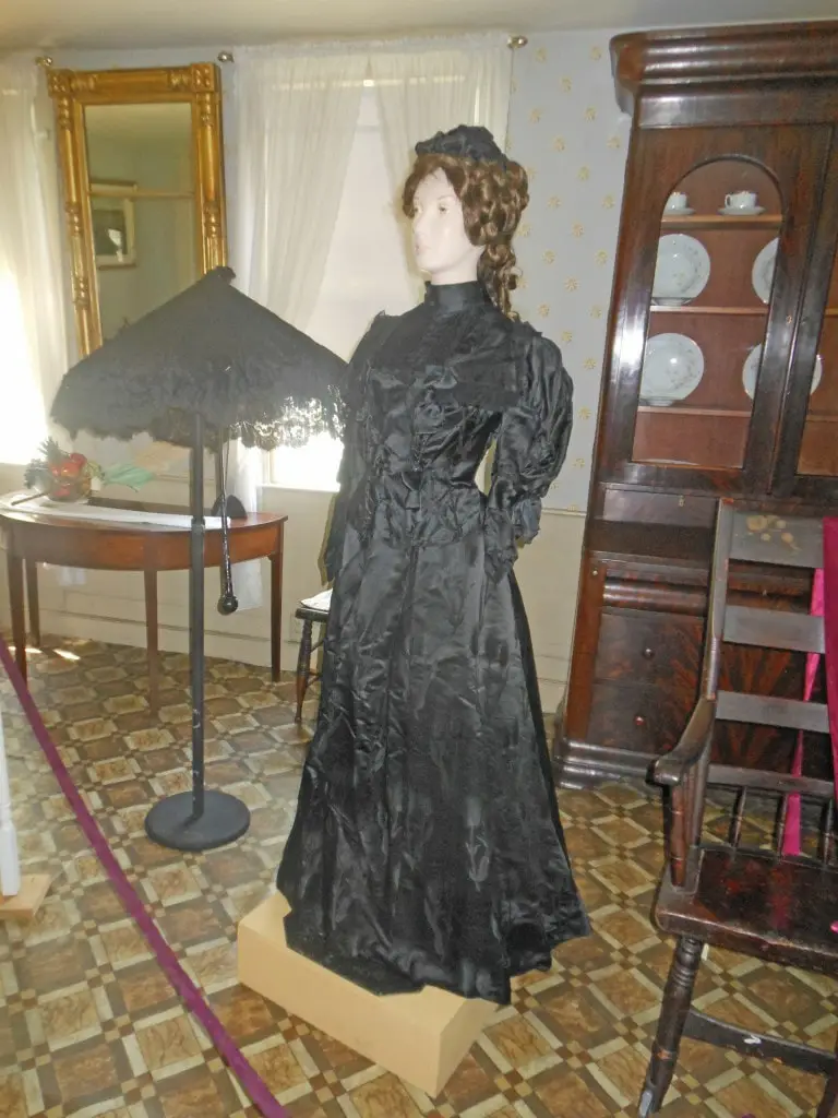 These gowns beautifully fit into our title “promenade” which means to take a leisurely walk, ride, or drive in public,especially to meet or be seen by others. The “ladies” in our exhibit would have used parasols while wearing these gowns to promenade in the park or while riding in their carriages.
