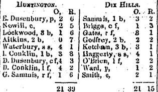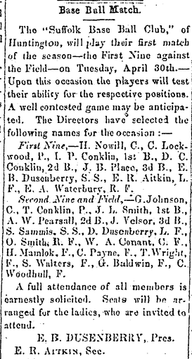 “A series of base ball matches have been played between the Huntington and Dix Hills Base Ball Clubs. The first game score: Huntington 21 outs 31 runs; Dix Hills 21 outs, 25 runs… The second game was played at Dix Hills before a large audience of ladies, the score being as follows: Huntington, 15 outs 21 runs. Dix Hills 15 outs, 30 runs… The home & home match (rubber game) was played in Huntington at Woodhull Conklin’s lot on Wednesday, before as fine and large an audience as have ever assembled for such an occasion in this county.”