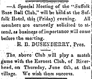 In April of the following year, the Suffolk Base Ball Club held an inter-club match between the 1st Nine and the Field, to select the team for 1867. The following month they called for a meeting to be held on Friday evening at the Suffolk Hotel on Main Street to ready them for the up-coming season.
