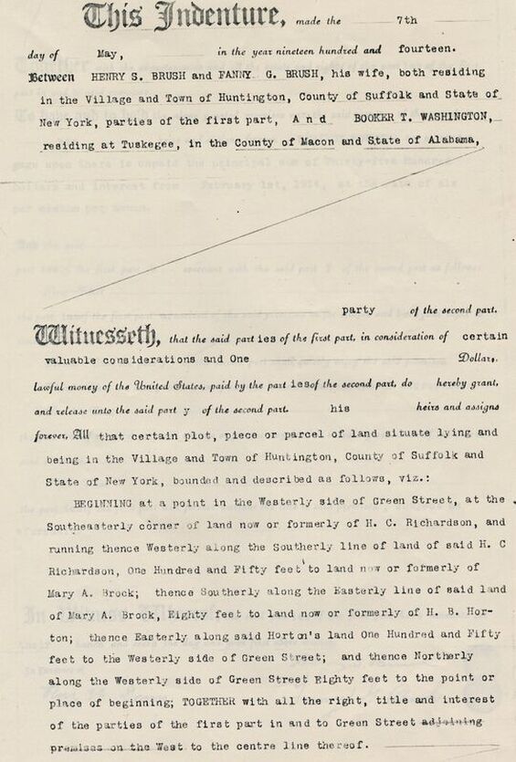 According to this deed dated May 7, 1914, Henry and Fanny Brush transferred property at 43 Greene Street, Huntington to Booker T. Washington. The house still stands today and is the location of Finley’s Restaurant.