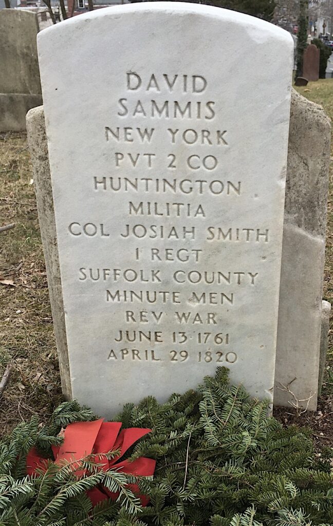 During the American Revolution, David was a private in Colonel Josiah Smith’s 1st Regiment of Minutemen, Huntington Militia. That service is confirmed in New York in the Revolution as Colony and State classifiedby James A. Roberts and in the U.S. Revolutionary War Burial Index which cites the scholarly work by Frederic G. Mather, The Refugees of 1776 from Long Island to Connecticut (page 996, 1913). David’s service as a private is also confirmed in the Patriot Research System, an index compiled by the Sons of the American Revolution (SAR), which shows applicants approved in 1974 and 2006 through descendants of Luther Sammis, the son of David and Mary née Carpenter. According to Huntington Town Records, Volume III, David Sammis’s name is among those in the militia serving under Captain Cornelius Conkling who were ordered on duty on October 13, 1777, when Huntington was occupied by the British. On May 18, 21, 22 and 23, 1778, David was among those ordered by the British to build the fort at Lloyd’s Neck, an example of the oppression and suffering imposed on Huntington’s citizens during the occupation. Like many Huntingtonians, he signed the Oath of Loyalty to the Crown in 1778, although in the signatories were coerced by the occupying British and loyalist forces to do so. In 1782, Huntington Town Records (Assessment of Property in Huntington About The Close Of The War) show that David owned farm land (15 acres) and that he headed a family of two males and two females and no slaves. Further, the appendix for 1782 names him as one of the two town collectors of forage.