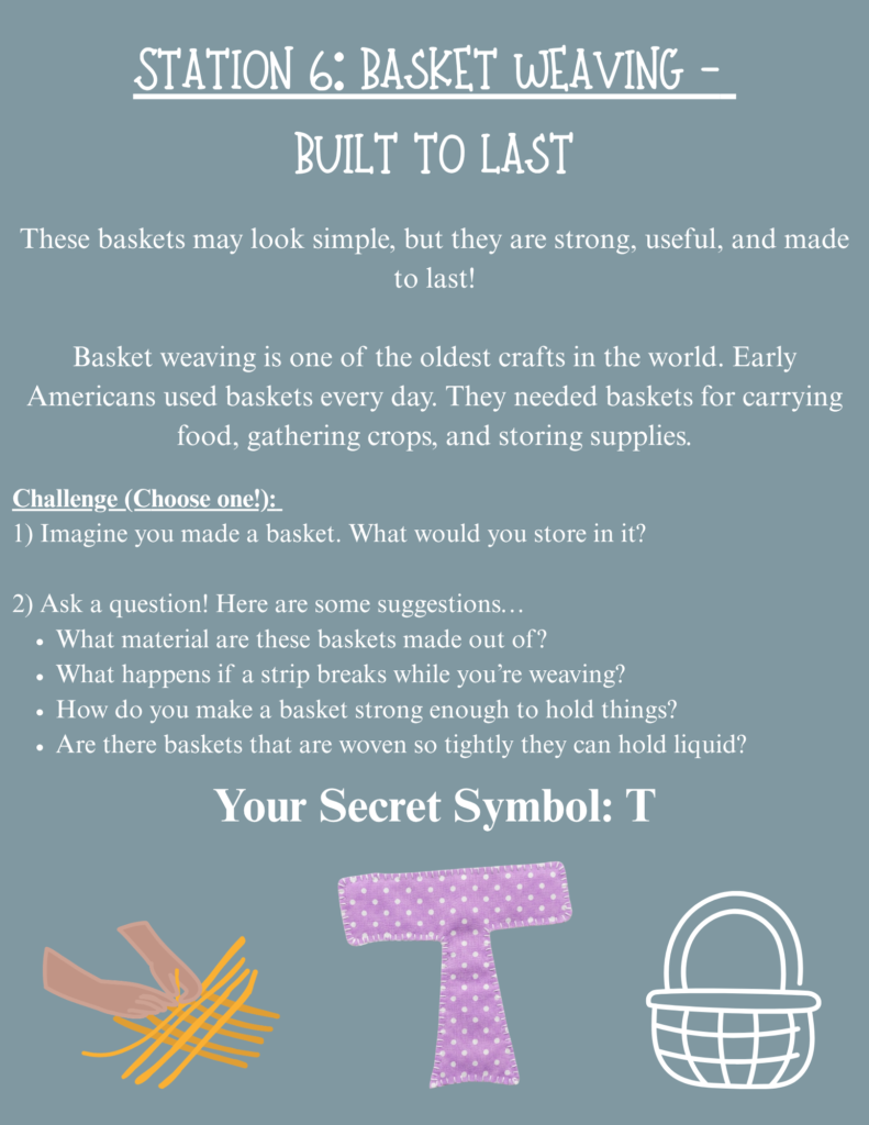 Basket weaving is one of the oldest crafts in the world. Early Americans used baskets to carry food, store goods, and help with daily chores.
