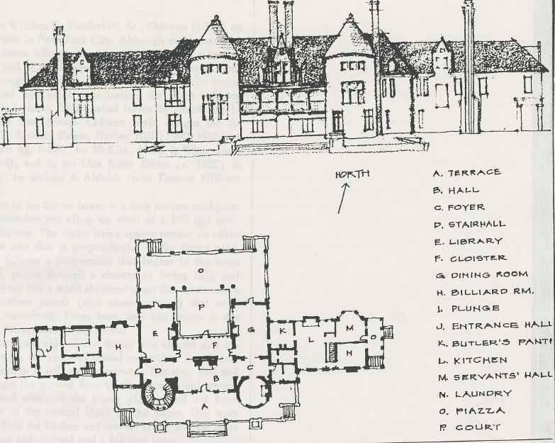 George McKesson Brown, heir to the McKesson Pharmaceutical Company fortune, purchased 135 waterfront acres facing Huntington Harbor. In approximately 1906 Brown commissioned architect Clarence Summer Luce to design a mansion inspired by chateaus he had seen while on vacation with his wife in the Loire Valley. The French Chateau style in architecture became popular in the United States around the late 19th century. This style reflected 16th century French chateaus with gabled roofs, conical towers, spires and arched entryways.