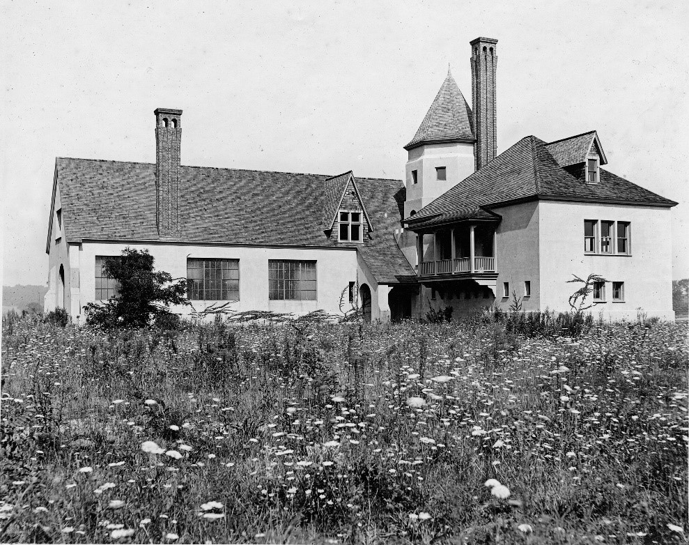Completed in 1912, the estate was known as West Neck Farm. It was essentially a self-contained manor with cows, chickens, pigs and bees as well as vegetable gardens. The out buildings, such as the garage and chauffeur’s quarters (now Unitarian Fellowship), the boat house, and the water tower were designed to reflect the style of the main mansion.
