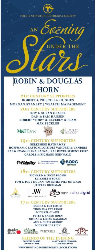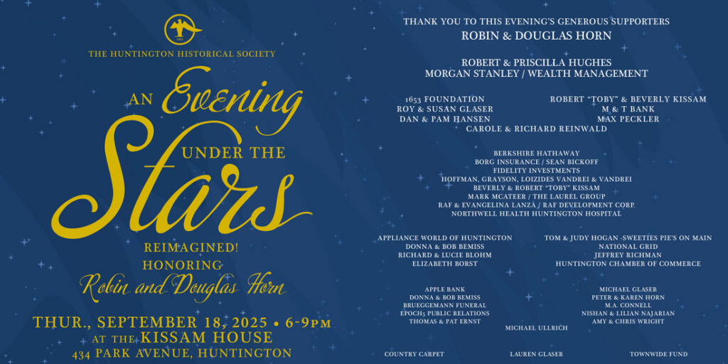 Becoming a sponsor for this event is an excellent opportunity to show your support of local history as well as showcase your business. Your sponsorship helps the Society continue its ongoing mission of sharing the Town of Huntington’s history and preserving it for the future.