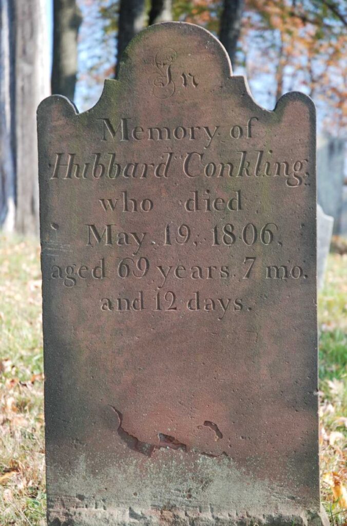 Mary Wood Conkling, Hubbard’s first wife, died on October 29, 1786 at the age of 46. The biography on his Find A Grave webpage notes that Hubbard’s second wife was Rebecca née Titus, the widow of Richard Conklin (see); Hubbard and Rebecca married on January 7, 1789. After Rebecca’s death, he married Sybel née Mead (or Sibbel) on October 7, 1793; he was widowed again after her death on September 1, 1805.