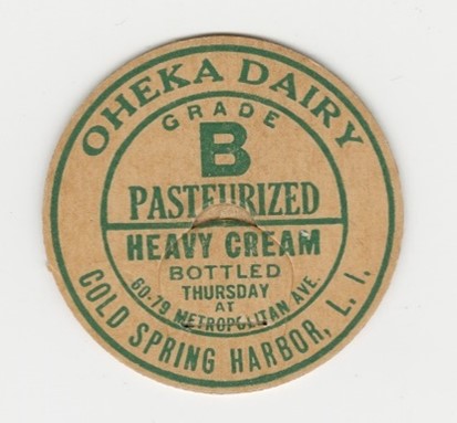 Once upon a time there were over 70 commercial dairy farms in the Town of Huntington. In the early years, when Huntington was an agrarian community, people relied on locally produced goods. Many grew their own food, or patronized local retail shops like butchers, bakers and produce stores-all selling local products. During the 19th century as the town population grew, a larger market for fresh produce developed and farmers began to specialize in certain crops. Many farmers started to raise more dairy cows to meet the increasing demand for fresh milk. Milk would be delivered by horse and wagon. Customers would bring out their own crocks and the milk was ladled out of metal cans in the back of the wagon. By the late 1800s dairies began to bottle their own milk with the name of the town and dairy embossed on the bottle. These early milk bottles used metal caps similar to Ball canning jars, others used a paper cap to seal the bottle.