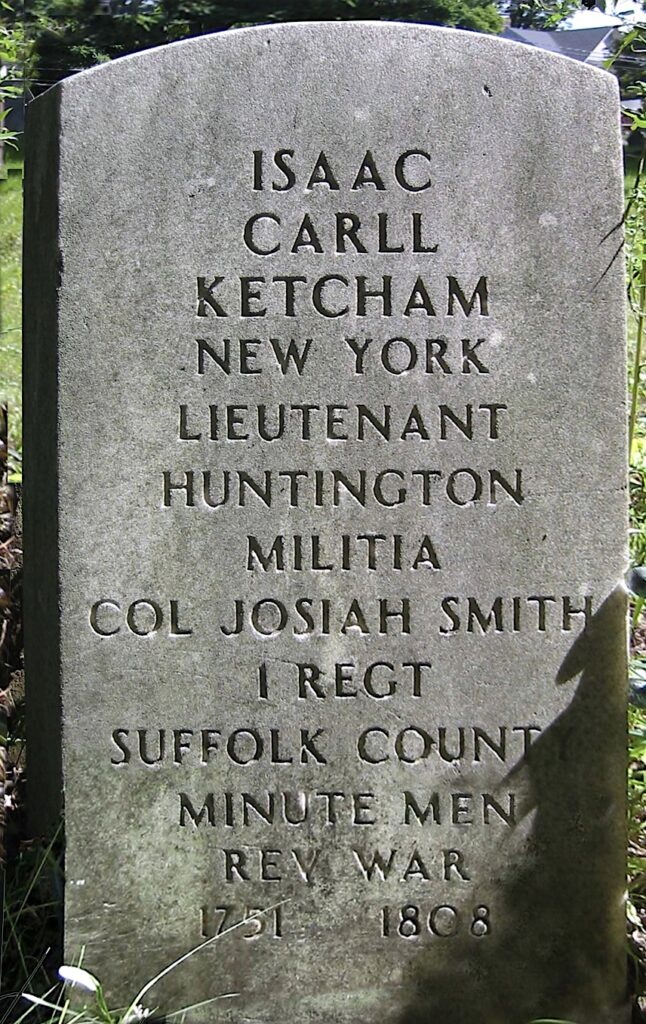 KETCHAM (or KETCHUM), ISAAC CARLL (or CARLE, CARIL, CARL ISAAC) (1751-1808). Lieutenant, Colonel Josiah Smith’s Regiment, 1st Regiment Suffolk County Minutemen, Huntington Militia. According to the United States Revolutionary War Burial Index, Isaac was born in 1751. This differs from a family tree on Ancestry.com which details that Isaac was born on February 11, 1752, in Huntington, Suffolk County, New York, to Charity née Carll and Nathaniel Ketcham. He was the third of five siblings; he had three brothers and one sister. On some official documents his surname is spelled as Ketchum and his given name is denoted as Carle, Caril and Carl Isaac.
