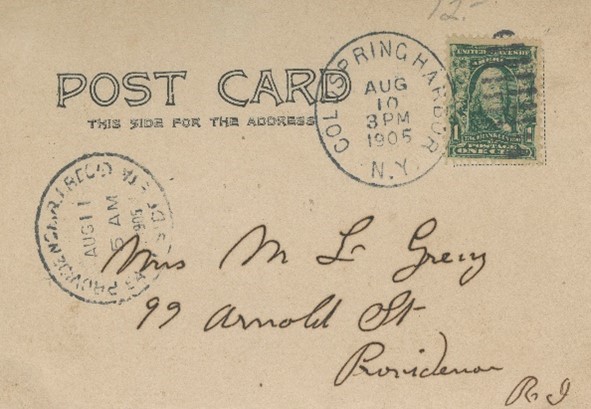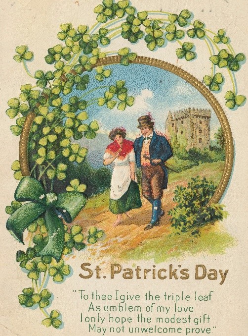 Above, St. Patrick’s Day Postcard, (circa 1907-1910), published by E.Nash, an illustrator and publisher of high quality holiday postcards. The card represents the “Divided Back Era” of early postcards. In March 1907, congress passed an act allowing privately produced postcards to have messages on the left half of the card. The next day the Postmaster-General issued Order No. 146 echoing the congressional act. Prior to 1907, the “Undivided Back Era,” messages were not allowed on the back of postcards and sometimes messages were scribbled on bottom of the image side.