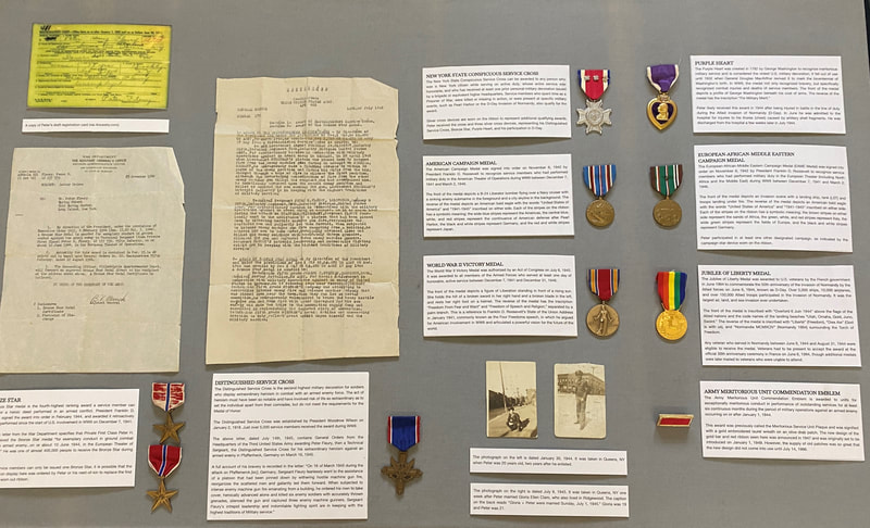 This exhibition tells the story of a Huntington veteran, Peter Fleury, who fought in World War II and participated in the invasion of Normandy, France on June 6, 1944, known as D-Day. On display are military letters, personal photographs, and nine medals that Peter received for his service during World War II, including the Distinguished Service Cross, Bronze Star, and Purple Heart.