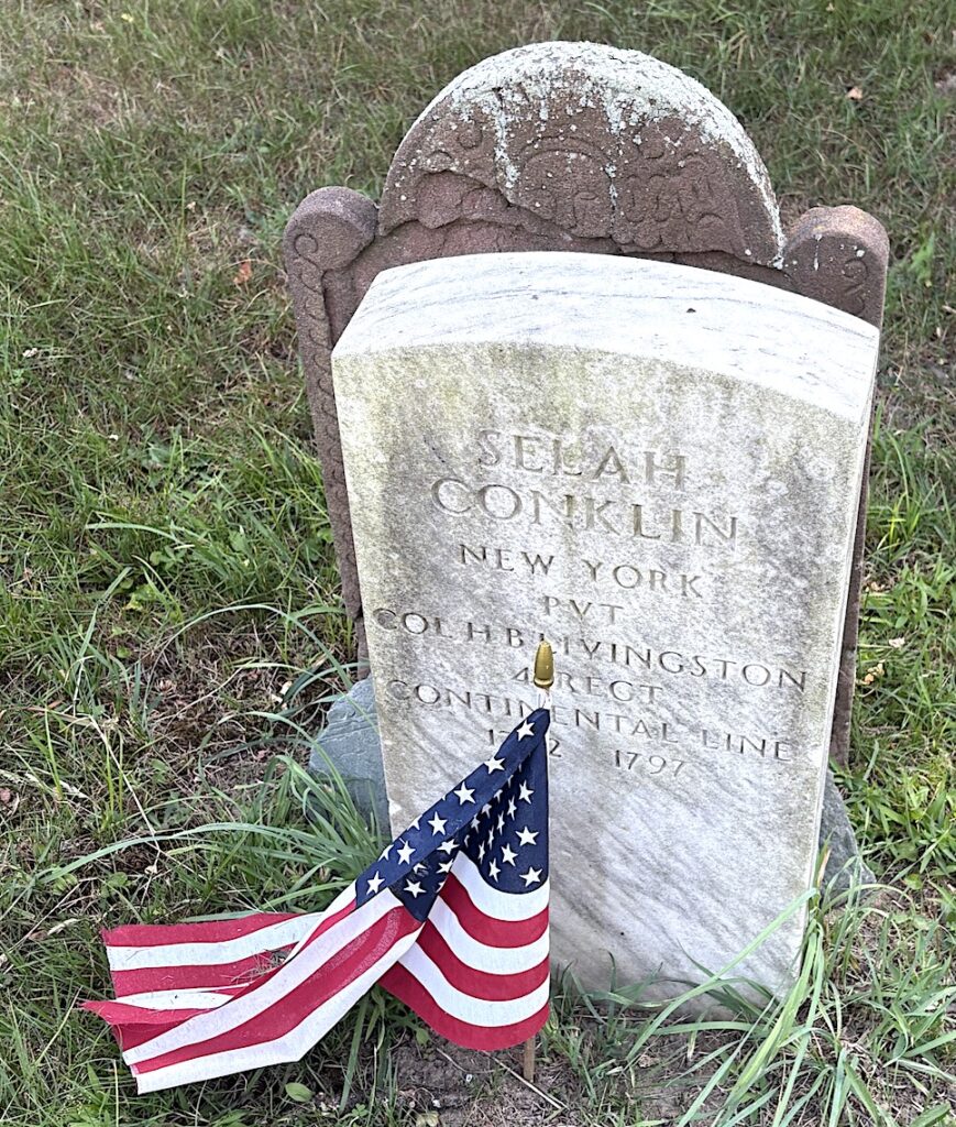 According to his headstone at Huntington’s Old Burying Ground, Selah was a private in Colonel Livingston’s Continental Line; that information is likely incomplete. As per Wendy Polemus-Annibell, the head librarian of the Suffolk County Historical Society, Conklin’s service during the American Revolution was in the 3rd Regiment, Colonel James Clinton’s Regiment, likely in Captain John Grennell’s 3rd Company and in the 4th Regiment, Colonel Henry B. Livingston’s Company, Captain Daniel Roe’s Company, Continental Army. (The 4th Regiment, which was re-organized and re-designated often, was initially the 2nd Regiment in 1775 and also consolidated into the 2nd Regiment after January 1781.)