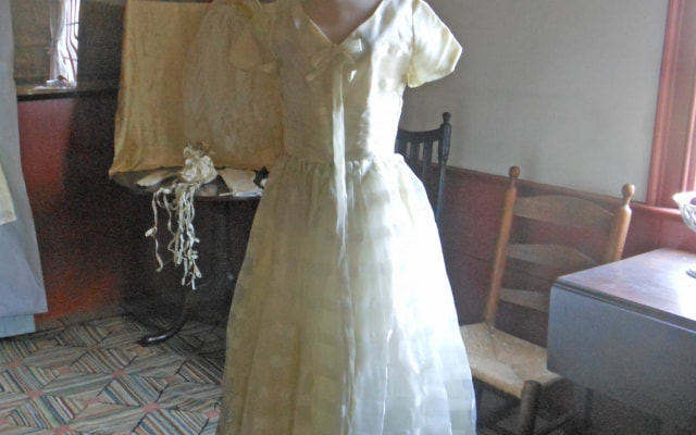 The Exhibit “Wedding Days & Wedding Nights” provides a view of wedding attire from the late 1800’s through the 1950’s. In addition to the gowns and nightwear of the brides, there is some clothing for the men worn during the ceremonies. There are also photos of couples, brides and wedding parties from the period. The gowns reflect Wedding Advice from Ladies Home Journal, from March 1894: