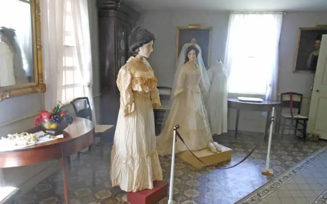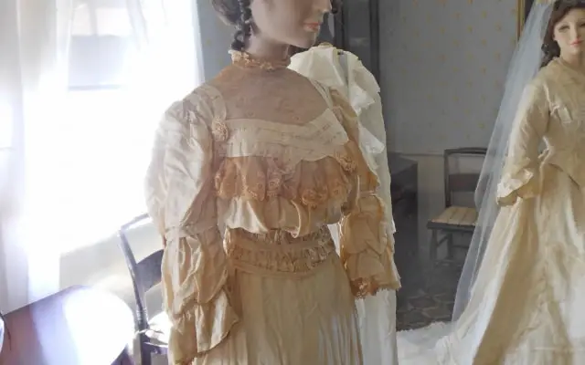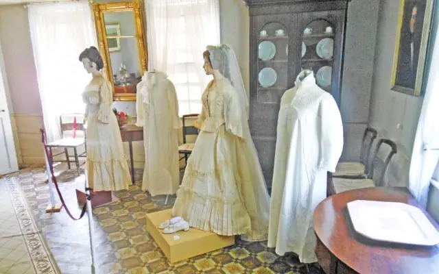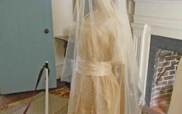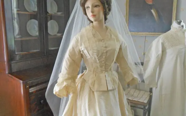 The Ladies of the Attic, our costume collection committee, selected gowns for this exhibit to highlight fashion changes in vogue in the 19th and 20th centuries and matched them with their nightwear counterparts. Lovingly hand-made nightgowns transition to embellished silky sheer peignoirs. The result is a fun and informative look at the changing styles of brides over the decades and a peak at what they might have worn on their special night. Fashions in Wedding gowns, and weddings are constantly changing. In the early 1800’s, weddings were very solemn affairs held in a church. The bride wore a dress with a high neckline and long sleeves and was reminded she was attending a religious service and not a ball.