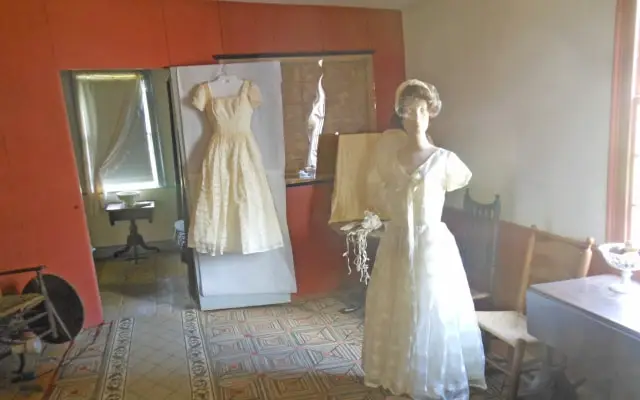 Many brides married in their “Best Dress”, which would be of any color, including black or brown. Many married in their going-away dress, often practical traveling suits but specially trimmed for their wedding day. The bride would wear a bonnet or veil. Although not shown in the exhibit, there are many wedding dresses in the collections matching these descriptions.